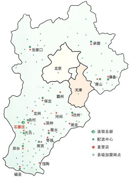 河北省農(nóng)業(yè)生產(chǎn)資料集團(tuán)有限公司十分重視市場(chǎng)營(yíng)銷網(wǎng)絡(luò)建設(shè) , 充分利用供銷社內(nèi)外資源,用現(xiàn)代流通方式改造傳統(tǒng)經(jīng)營(yíng)網(wǎng)絡(luò),大力發(fā)展農(nóng)資連鎖經(jīng)營(yíng)。自1998年開始在全省及周邊省份組建分公司,2002年發(fā)展縣鄉(xiāng)分銷網(wǎng)點(diǎn), 2005年啟動(dòng)以“河北農(nóng)資豐澤苑”為統(tǒng)一品牌的農(nóng)資連鎖經(jīng)營(yíng)網(wǎng)絡(luò)工程,通過(guò)大力實(shí)施農(nóng)資配送中心建設(shè)、終端網(wǎng)絡(luò)體系升級(jí)改造建設(shè)、農(nóng)化服務(wù)體系建設(shè)和農(nóng)資信息服務(wù)體系建設(shè),已經(jīng)構(gòu)建起以省農(nóng)資公司為龍頭,以區(qū)域配送中心為骨干,以縣市分銷中心為依托,以鄉(xiāng)村農(nóng)資連鎖店為基礎(chǔ),覆蓋全省、輻射周邊、上下貫通、流通有序的現(xiàn)代農(nóng)資經(jīng)營(yíng)服務(wù)網(wǎng)絡(luò)體系。目前,區(qū)域配送中心16個(gè),縣級(jí)分銷(配送)中心156個(gè),鄉(xiāng)村加盟(直營(yíng))店3000多家。