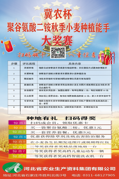 隆堯縣是河北省糧食生產(chǎn)核心區(qū)建設(shè)縣,是全國有名的方便面生產(chǎn)基地,全縣小麥種植面積60多萬畝,其中優(yōu)質(zhì)強筋麥面積超過30萬畝,隆堯小麥種植優(yōu)勢明顯。為使更多農(nóng)戶用上聚谷氨酸二銨,公司特舉辦“冀農(nóng)杯”聚谷氨酸二銨秋季小麥種植能手大賽,就是想以大賽的形式,讓廣大農(nóng)民用上好肥料,取得好收成,讓經(jīng)銷商得到好回報。
