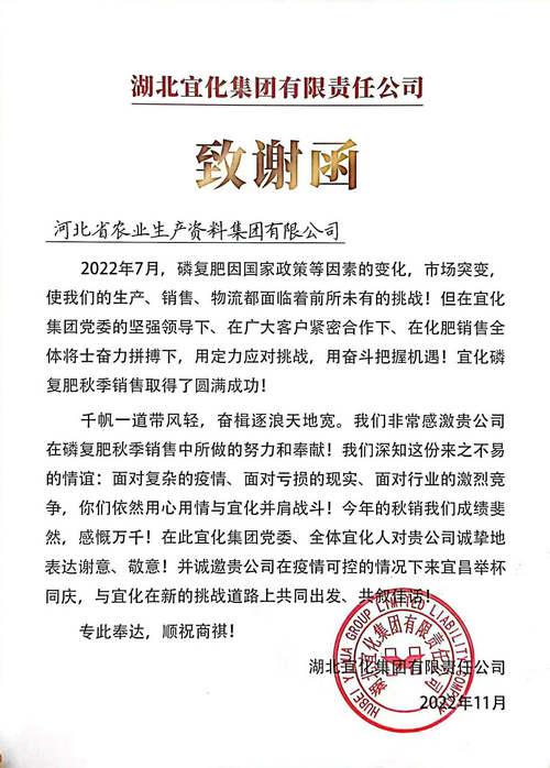 本網(wǎng)訊 近日,湖北宜化集團(tuán)有限責(zé)任公司向集團(tuán)公司發(fā)來(lái)致謝函,對(duì)雙方良好的合作表示高度肯定,對(duì)集團(tuán)公司在疫情和市場(chǎng)形勢(shì)的雙重壓力下對(duì)湖北宜化的大力支持表示衷心地感謝。作為河北省農(nóng)資流通領(lǐng)域的龍頭企業(yè),河北省農(nóng)資集團(tuán)今后將與湖北宜化集團(tuán)進(jìn)一步加強(qiáng)業(yè)務(wù)合作,深入拓展合作空間,強(qiáng)強(qiáng)聯(lián)手,互利共贏,共同創(chuàng)造新的輝煌。