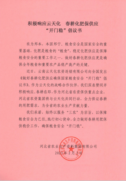 近日,云南云天化農(nóng)資連鎖有限公司向全國發(fā)出《做好春耕化肥供應(yīng)確保國家糧食安全“開門穩(wěn)”倡議書》。作為云天化的戰(zhàn)略合作伙伴,我們深表贊同并積極響應(yīng)。春耕在即,作為河北省農(nóng)資保供重點企業(yè),河北省農(nóng)資集團將與云天化共同行動,全力保證春耕的用肥需求,為全省的農(nóng)業(yè)生產(chǎn)貢獻力量。