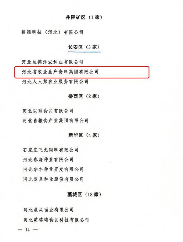 本網(wǎng)訊 近日,石家莊市人民政府公布了石家莊市農(nóng)業(yè)產(chǎn)業(yè)化重點(diǎn)龍頭企業(yè)名單,河北省農(nóng)業(yè)生產(chǎn)資料集團(tuán)有限公司獲評(píng)“石家莊市農(nóng)業(yè)產(chǎn)業(yè)化重點(diǎn)龍頭企業(yè)”。